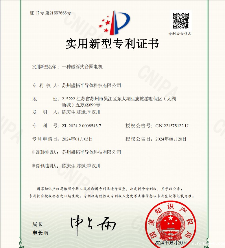 2023年加入苏州盛拓半导体科技有限公司后,他带领团队承担起“卡脖子”技术攻关重任,为华为、上海微电子、中科飞测、比亚迪等企业研发光刻机核心组件特种电机,包括高频音圈电机、主动磁浮精密运动系统等。2024年,他担任了苏州盛拓半导体科技有限公司电机产品部电机主管一职,还获得3项实用新型专利。